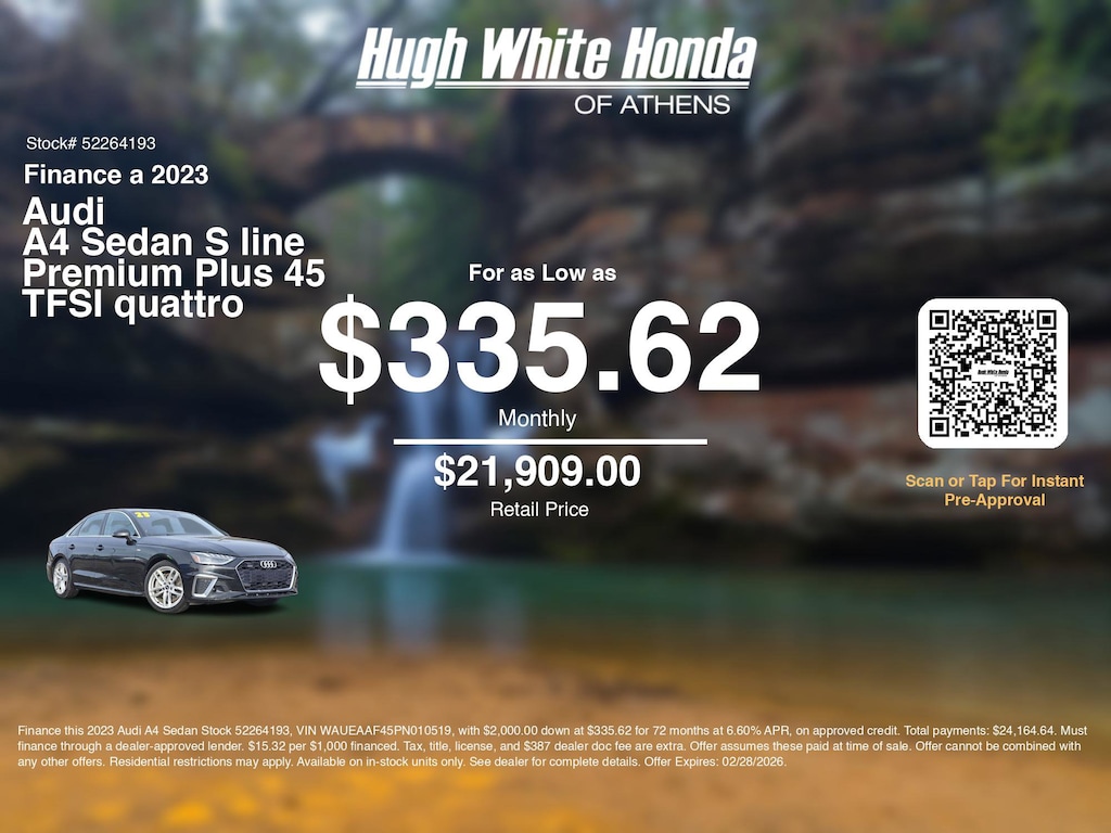 Our car loan payment calculator can help you calculate car payment options for this and other Honda finance offers that leverage the benefits of Honda Financial Services.@@ Call or drive in for Honda finance deals like this stunning 2023 Audi A4 Sedan with finance options near Athens!  Use our car monthly payment calculator to estimate your car payment, or try our car payment estimator to explore different loan terms. These Honda finance specials end 2/28/2026.