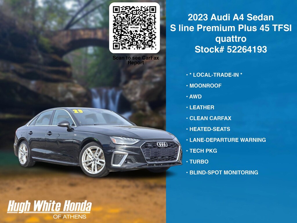 Free CARFAX report! DESIRABLE FEATURES: * LOCAL-TRADE-IN *, AWD, CLEAN CARFAX, MOONROOF, LEATHER, LANE-DEPARTURE WARNING, TECH PKG, HEATED-SEATS, TURBO, BLUETOOTH, BACKUP CAMERA, BLIND-SPOT MONITORING, FOG LAMPS, MULTI-ZONE AC, BACKUP-SENSORS, ALLOY-WHEELS, HOMELINK, Remote entry. Your 2023 Audi A4 Sedan S line Premium Plus 45 TFSI quattro is perfect for daily work or weekend road trips to our neighboring communities of Athens.