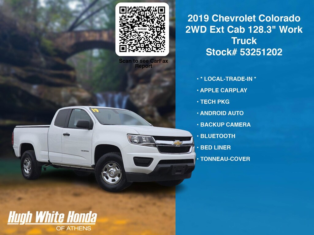 DESIRABLE FEATURES: * LOCAL-TRADE-IN *, APPLE CARPLAY, TECH PKG, ANDROID AUTO, BLUETOOTH, BED LINER, BACKUP CAMERA, TONNEAU-COVER. Your 2019 Chevrolet Colorado 2WD Ext Cab 128.3" Work Truck is perfect for daily work or weekend road trips to our neighboring communities of Athens.