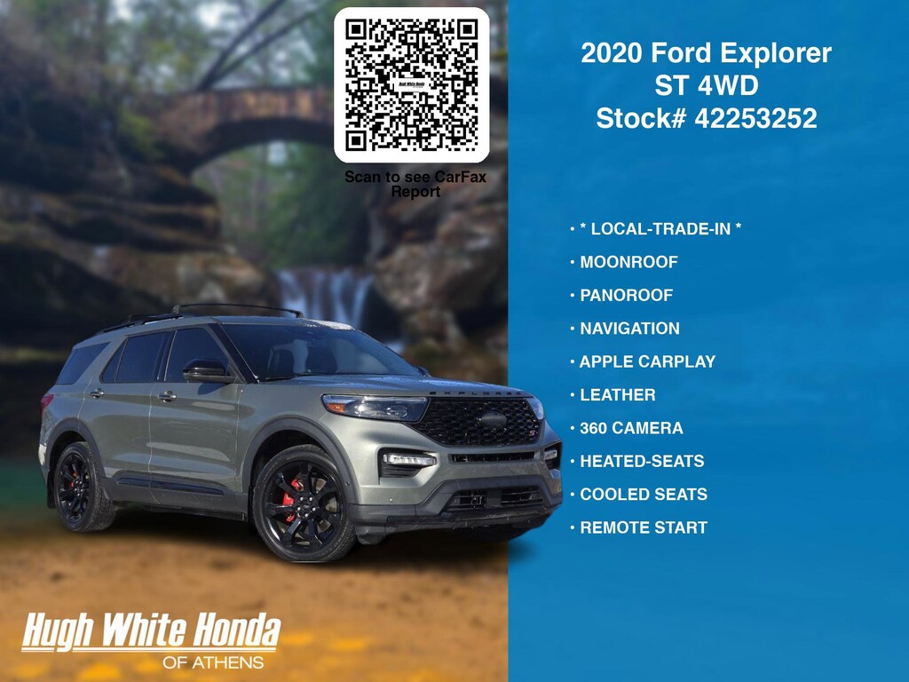 (844) 859-8630 TO SCHEDULE YOUR TEST DRIVE of this 2020 Ford Explorer ST 4WD. You can also visit us at 250 Columbus Road. Athens, OH 45701 to check it out in person! Our Hugh White Athens Used car dealership only sells used cars Athens, OH buyers can trust for safety and worry free driving.