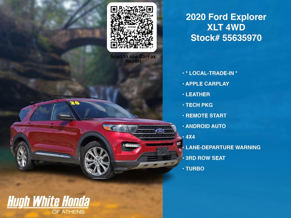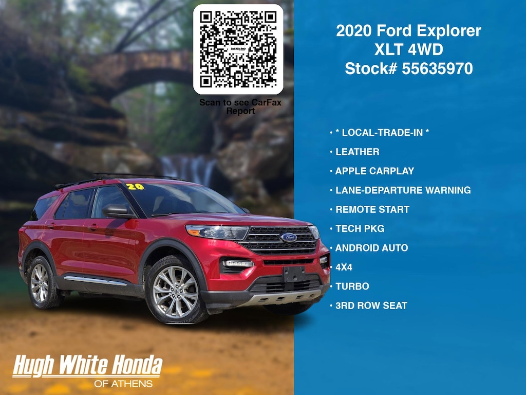 DESIRABLE FEATURES: * LOCAL-TRADE-IN *, APPLE CARPLAY, LEATHER, TECH PKG, 4X4, REMOTE START, ANDROID AUTO, LANE-DEPARTURE WARNING, KEYLESS-START, 3RD ROW SEAT, TOW PKG, TURBO, BACKUP CAMERA, BLIND-SPOT MONITORING, HANDS-FREE LIFTGATE, POWER LIFT-GATE, BLUETOOTH, MULTI-ZONE AC, BACKUP-SENSORS, WiFi Hotspot, Remote entry, SiriusXM. Your 2020 Ford Explorer XLT 4WD is perfect for daily work or weekend road trips to our neighboring communities of Athens.