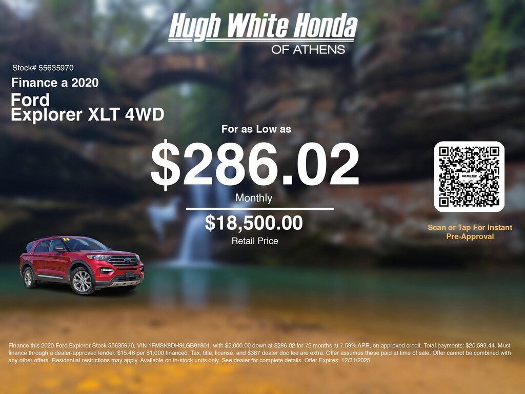 If you're ready to finance a quality used vehicle near Athens, Nelsonville, Logan, and Parkersburg, Hugh White Honda of Athens is thrilled to offer you a competitive finance offer on this 2020 Ford Explorer XLT 4WD. Use our car payment calculator to estimate your monthly payments or see how the monthly payment of $286.02 is calculated for well-qualified buyers shopping at Hugh White Honda of Athens with Tier 1 credit:
