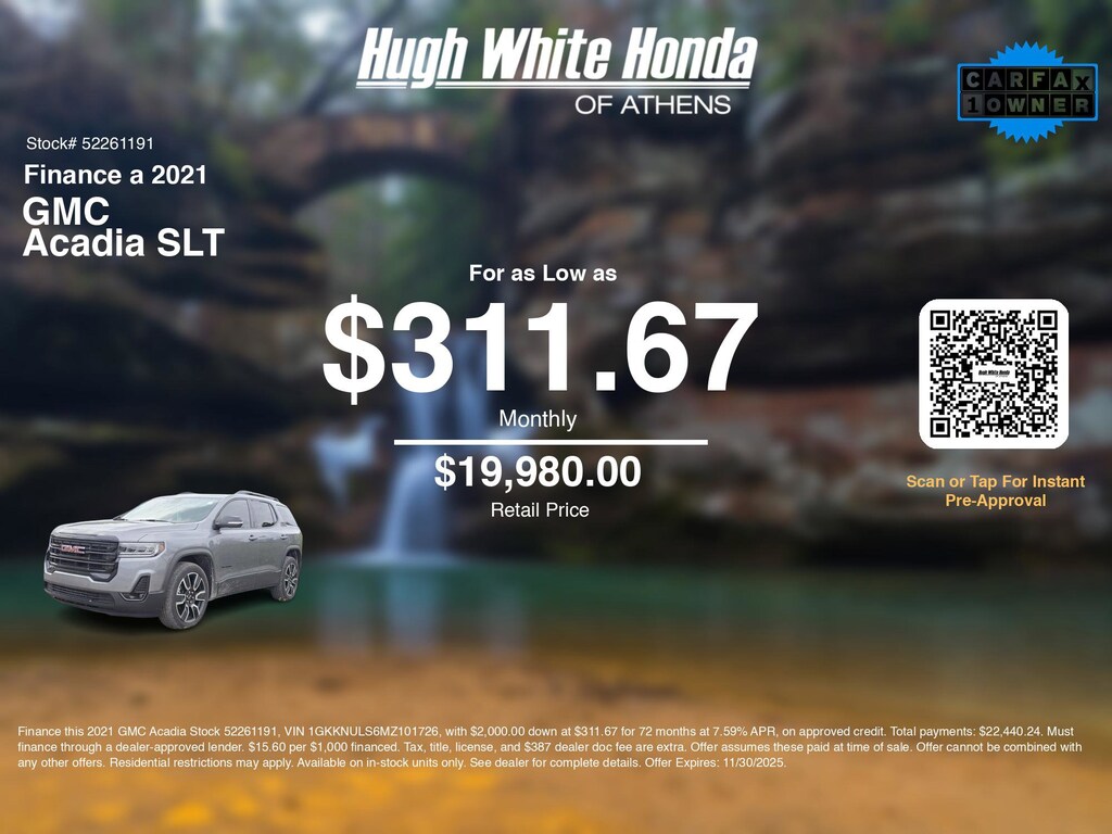 Our car loan payment calculator can help you calculate car payment options for this and other Honda finance offers that leverage the benefits of Honda Financial Services.@@ Call or drive in for Honda finance deals like this stunning 2021 GMC Acadia with finance options near Athens!  Use our car monthly payment calculator to estimate your car payment, or try our car payment estimator to explore different loan terms. These Honda finance specials end 11/30/2025.
