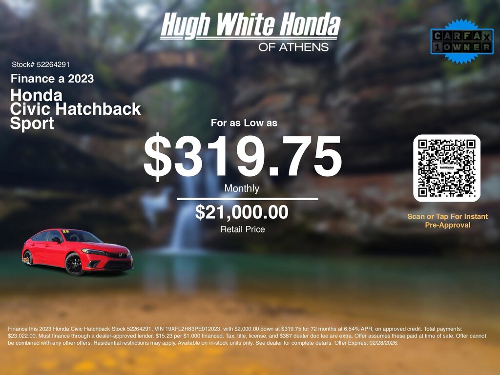 If you're ready to finance a quality used vehicle near Athens, Nelsonville, Logan, and Parkersburg, Hugh White Honda of Athens is thrilled to offer you a competitive finance offer on this 2023 Honda Civic Hatchback Sport. Use our car payment calculator to estimate your monthly payments or see how the monthly payment of $319.75 is calculated for well-qualified buyers shopping at Hugh White Honda of Athens with Tier 1 credit: