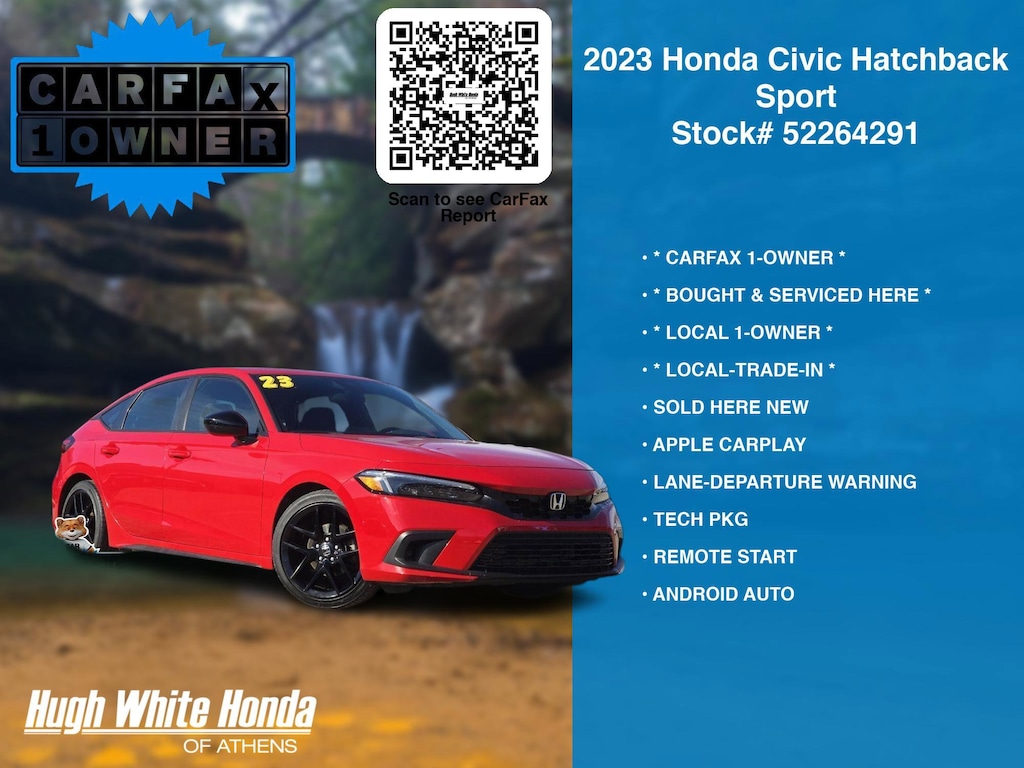 (844) 859-8630 TO SCHEDULE YOUR TEST DRIVE of this 2023 Honda Civic Hatchback Sport. You can also visit us at 250 Columbus Road. Athens, OH 45701 to check it out in person! Our Hugh White Athens Used car dealership only sells used cars Athens, OH buyers can trust for safety and worry free driving.