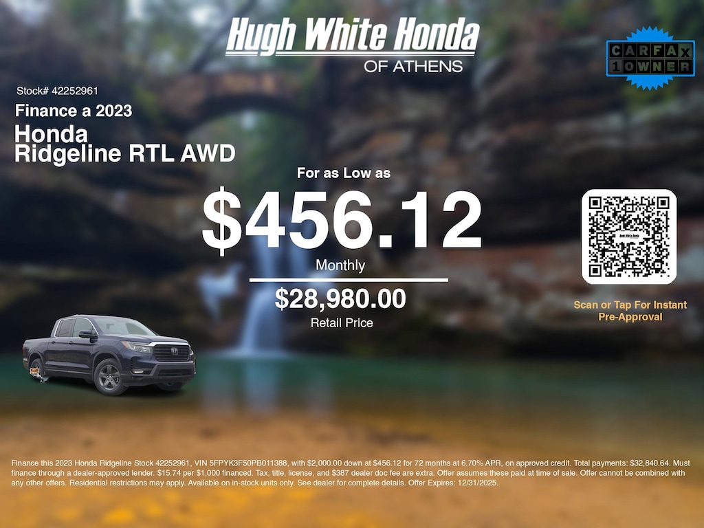 Our car loan payment calculator can help you calculate car payment options for this and other Honda finance offers that leverage the benefits of Honda Financial Services.@@ Call or drive in for Honda finance deals like this stunning 2023 Honda Ridgeline with finance options near Athens! Use our car monthly payment calculator to estimate your car payment, or try our car payment estimator to explore different loan terms. These Honda finance specials end 12/31/2025.