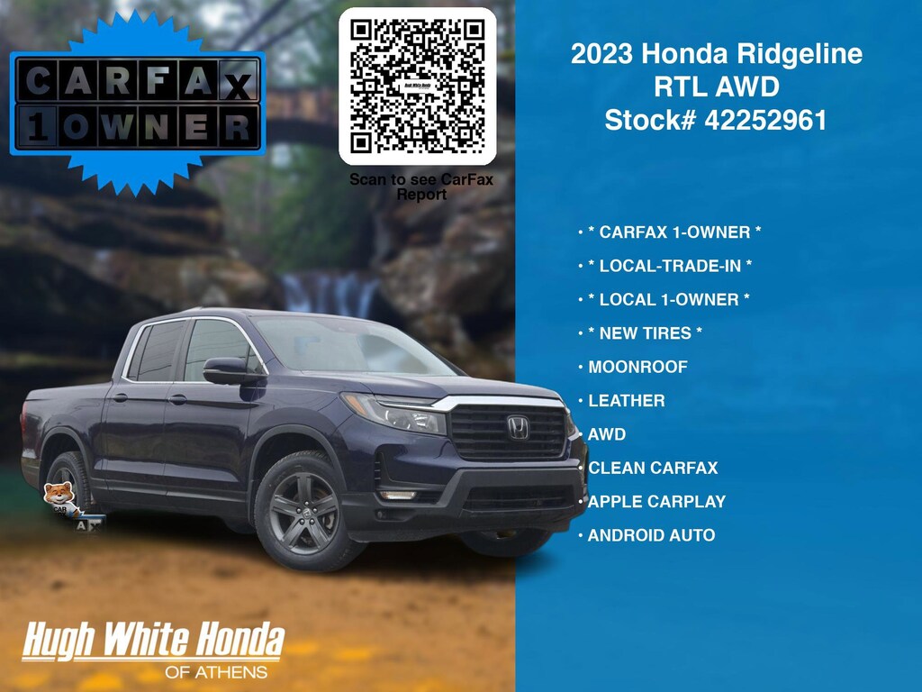 DESIRABLE FEATURES: * LOCAL-TRADE-IN *, * NEW TIRES *, * LOCAL 1-OWNER *, * CARFAX 1-OWNER *, APPLE CARPLAY, MOONROOF, AWD, LEATHER, CLEAN CARFAX, LANE-DEPARTURE WARNING, TECH PKG, HEATED-SEATS, REMOTE START, ANDROID AUTO, TOW PKG, KEYLESS-START, BLUETOOTH, BACKUP CAMERA, BLIND-SPOT MONITORING, BED LINER, FOG LAMPS, MULTI-ZONE AC, SiriusXM, Remote entry. Your 2023 Honda Ridgeline RTL AWD is perfect for daily work or weekend road trips to our neighboring communities of Athens.