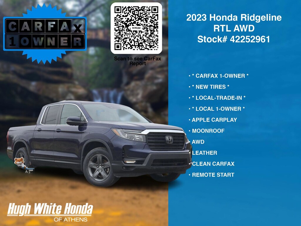 (844) 859-8630 TO SCHEDULE YOUR TEST DRIVE of this 2023 Honda Ridgeline RTL AWD. You can also visit us at 250 Columbus Road. Athens, OH 45701 to check it out in person! Our Hugh White Athens Used car dealership only sells used cars Athens, OH buyers can trust for safety and worry free driving.