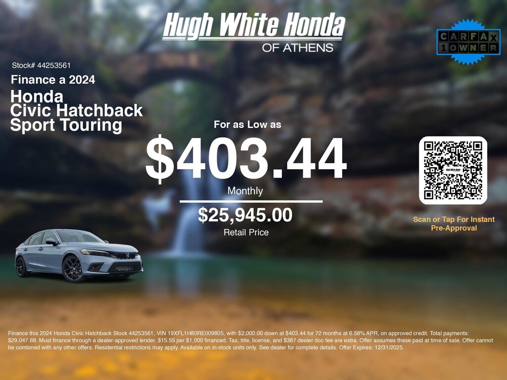 Our car loan payment calculator can help you calculate car payment options for this and other Honda finance offers that leverage the benefits of Honda Financial Services.@@ Call or drive in for Honda finance deals like this stunning 2024 Honda Civic Hatchback with finance options near Athens! Use our car monthly payment calculator to estimate your car payment, or try our car payment estimator to explore different loan terms. These Honda finance specials end 12/31/2025.