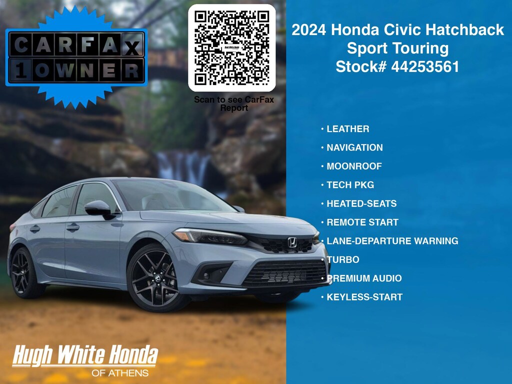 (844) 859-8630 TO SCHEDULE YOUR TEST DRIVE of this 2024 Honda Civic Hatchback Sport Touring. You can also visit us at 250 Columbus Road. Athens, OH 45701 to check it out in person! Our Hugh White Athens Used car dealership only sells used cars Athens, OH buyers can trust for safety and worry free driving.