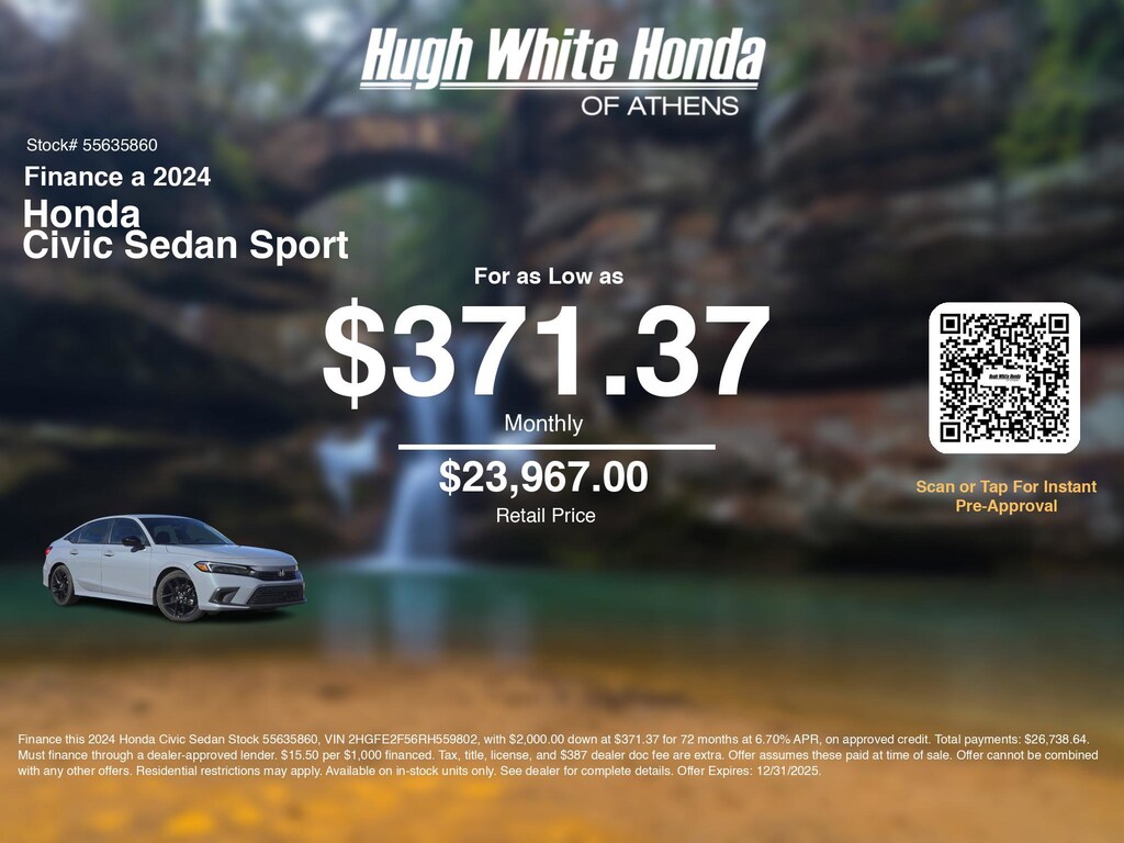 If you're ready to finance a quality used vehicle near Athens, Nelsonville, Logan, and Parkersburg, Hugh White Honda of Athens is thrilled to offer you a competitive finance offer on this 2024 Honda Civic Sedan Sport. Use our car payment calculator to estimate your monthly payments or see how the monthly payment of $371.37 is calculated for well-qualified buyers shopping at Hugh White Honda of Athens with Tier 1 credit: