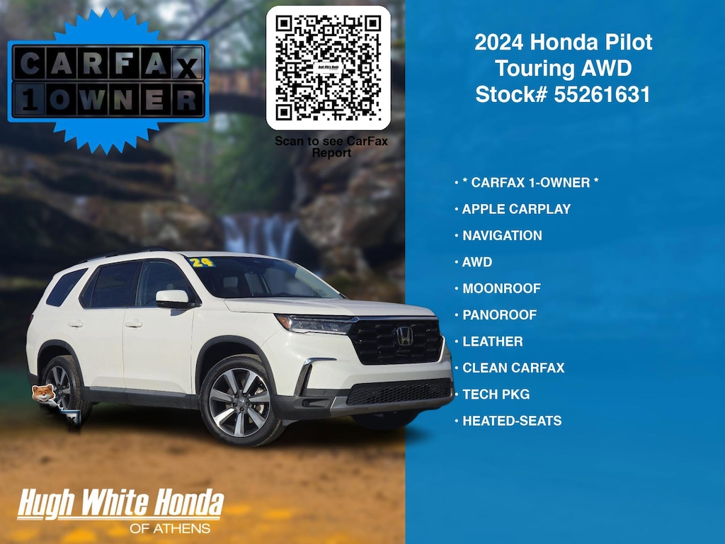 DESIRABLE FEATURES: * CARFAX 1-OWNER *, PANOROOF, LEATHER, APPLE CARPLAY, CLEAN CARFAX, NAVIGATION, AWD, MOONROOF, ANDROID AUTO, LANE-DEPARTURE WARNING, TECH PKG, HEATED-SEATS, REMOTE START, KEYLESS-START, 3RD ROW SEAT, HEATED-STEERING WHEEL, PREMIUM AUDIO, POWER LIFT-GATE, BACKUP CAMERA, HANDS-FREE LIFTGATE, BLUETOOTH, BLIND-SPOT MONITORING, WIRELESS PHONE CHARGING, FOG LAMPS, MULTI-ZONE AC, BACKUP-SENSORS, WiFi Hotspot, Remote entry, SiriusXM. Your 2024 Honda Pilot Touring AWD is perfect for daily work or weekend road trips to our neighboring communities of Athens.