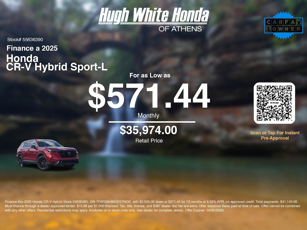 If you're ready to finance a quality used vehicle near Athens, Nelsonville, Logan, and Parkersburg, Hugh White Honda of Athens is thrilled to offer you a competitive finance offer on this 2025 Honda CR-V Hybrid Sport-L. Use our car payment calculator to estimate your monthly payments or see how the monthly payment of $571.44 is calculated for well-qualified buyers shopping at Hugh White Honda of Athens with Tier 1 credit: