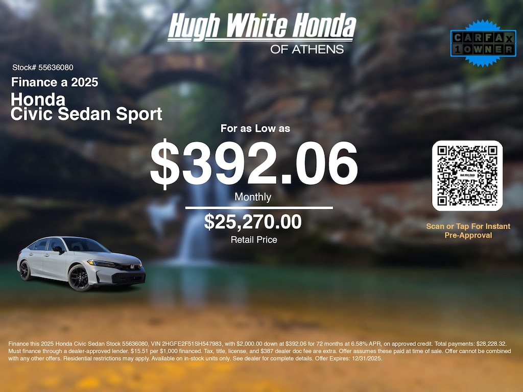 If you're ready to finance a quality used vehicle near Athens, Nelsonville, Logan, and Parkersburg, Hugh White Honda of Athens is thrilled to offer you a competitive finance offer on this 2025 Honda Civic Sedan Sport. Use our car payment calculator to estimate your monthly payments or see how the monthly payment of $392.06 is calculated for well-qualified buyers shopping at Hugh White Honda of Athens with Tier 1 credit: