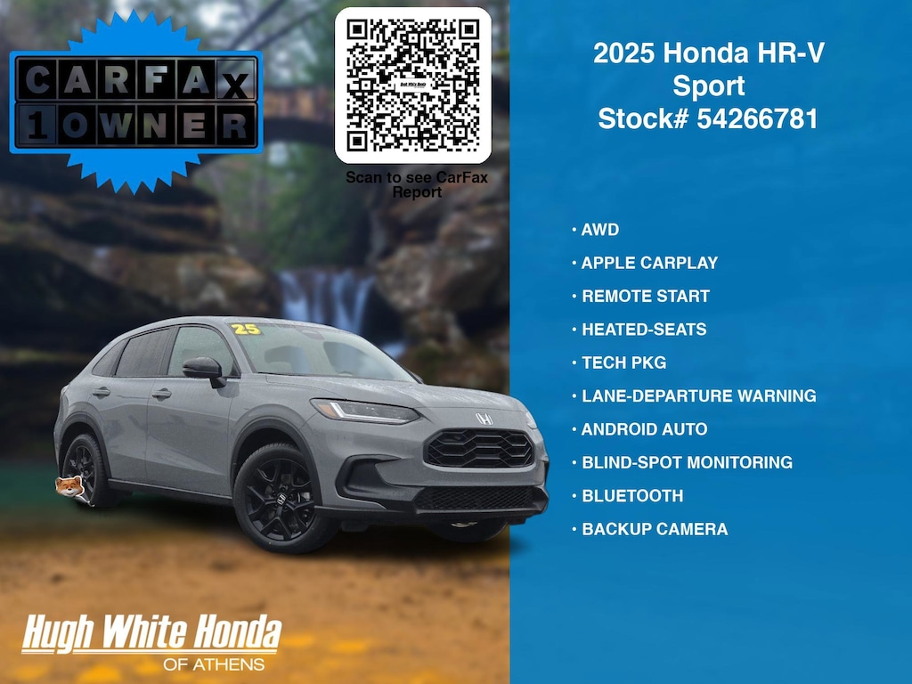 (844) 859-8630 TO SCHEDULE YOUR TEST DRIVE of this 2025 Honda HR-V Sport. You can also visit us at 250 Columbus Road. Athens, OH 45701 to check it out in person! Our Hugh White Athens Used car dealership only sells used cars Athens, OH buyers can trust for safety and worry free driving.