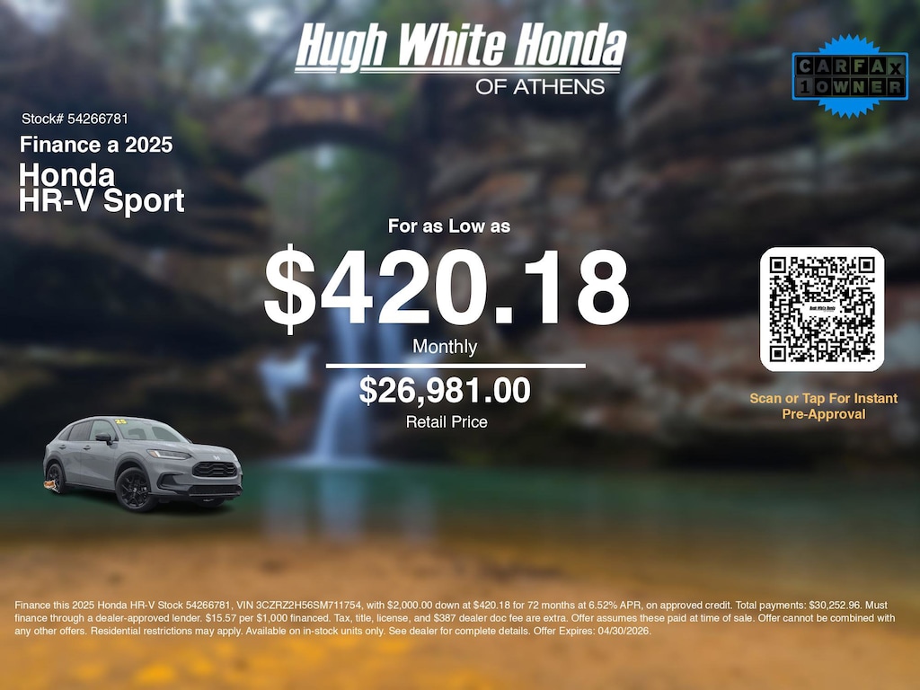 Our car loan payment calculator can help you calculate car payment options for this and other Honda finance offers that leverage the benefits of Honda Financial Services.@@ Call or drive in for Honda finance deals like this stunning 2025 Honda HR-V with finance options near Athens! Use our car monthly payment calculator to estimate your car payment, or try our car payment estimator to explore different loan terms. These Honda finance specials end 4/30/2026.
