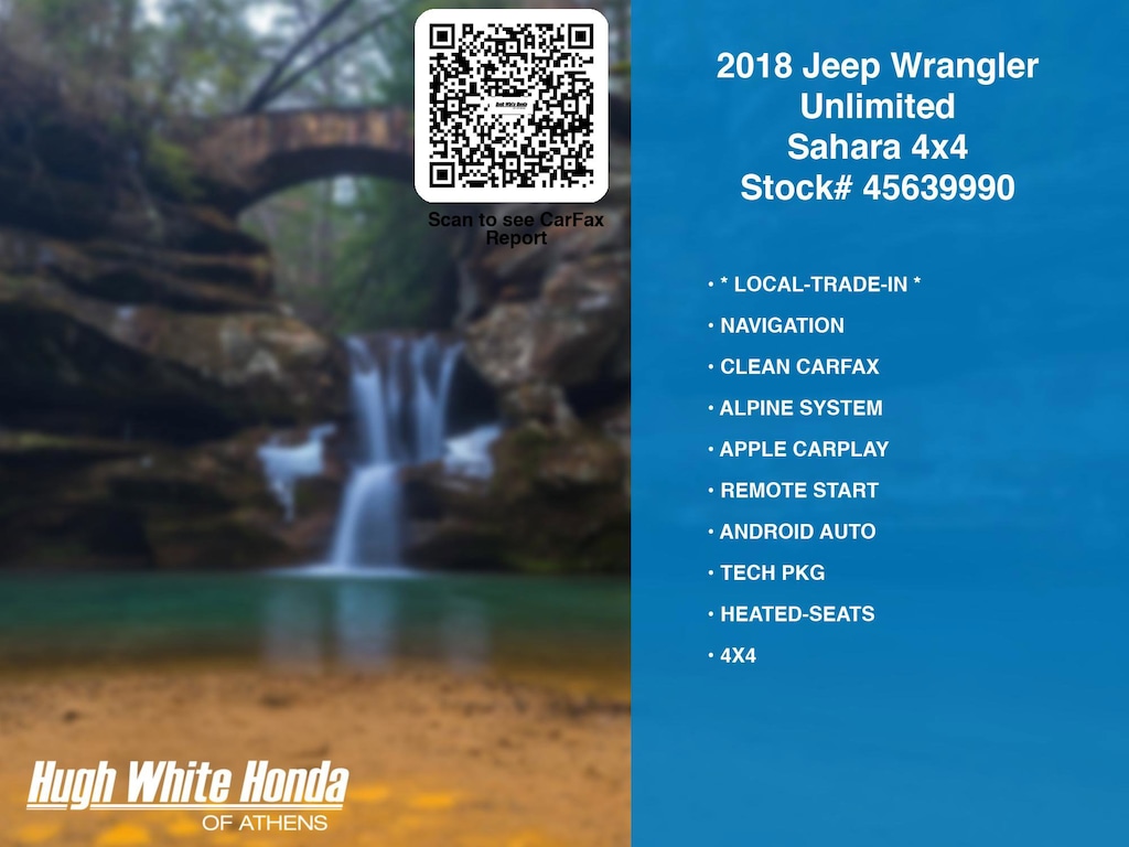 Free CARFAX report! DESIRABLE FEATURES: * LOCAL-TRADE-IN *, CLEAN CARFAX, ALPINE SYSTEM, NAVIGATION, APPLE CARPLAY, REMOTE START, HEATED-SEATS, 4X4, ANDROID AUTO, TECH PKG, KEYLESS-START, ALPINE AUDIO, HEATED-STEERING WHEEL, RUNNING BOARDS, BLUETOOTH, BACKUP CAMERA, MULTI-ZONE AC, FOG LAMPS, Remote entry, SiriusXM. Your 2018 Jeep Wrangler Unlimited Sahara 4x4 is perfect for daily work or weekend road trips to our neighboring communities of Athens.