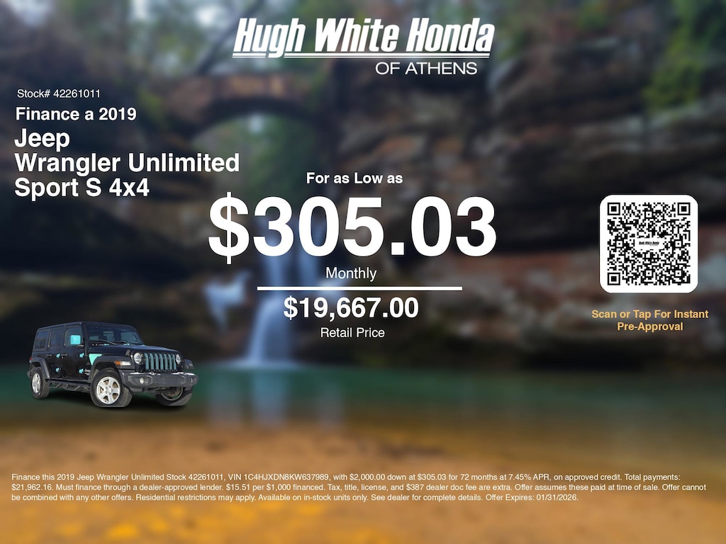 Our car loan payment calculator can help you calculate car payment options for this and other Honda finance offers that leverage the benefits of Honda Financial Services.@@ Call or drive in for Honda finance deals like this stunning 2019 Jeep Wrangler Unlimited with finance options near Athens! Use our car monthly payment calculator to estimate your car payment, or try our car payment estimator to explore different loan terms. These Honda finance specials end 1/31/2026.