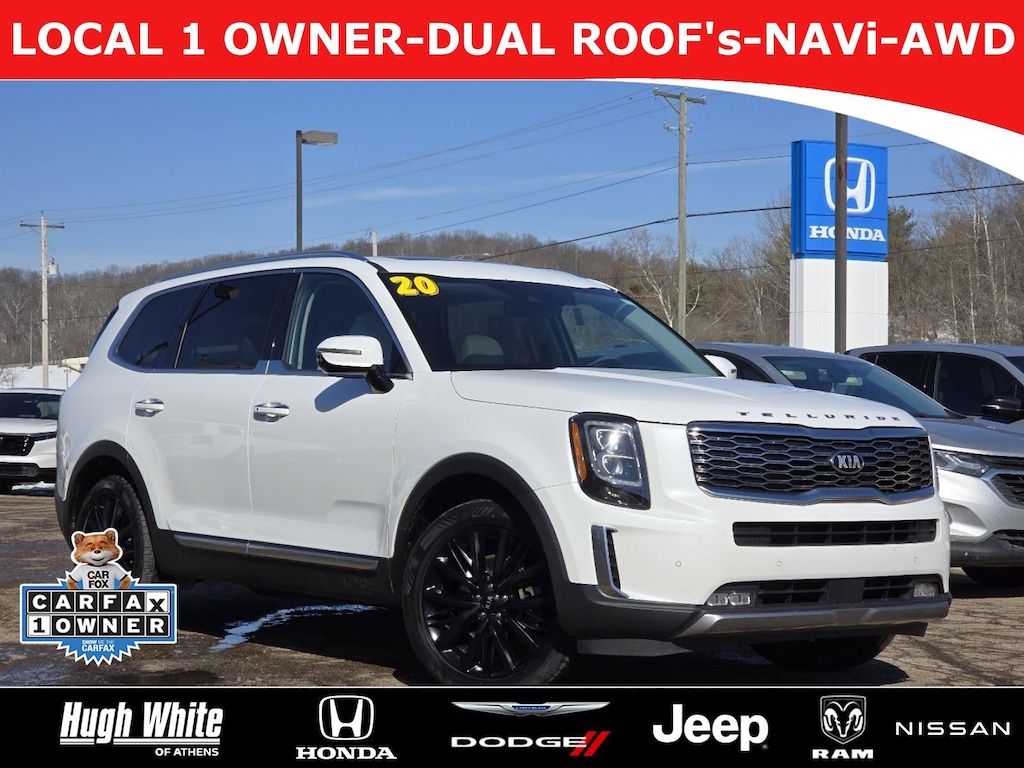 CARFAX VERIFIED 1-OWNER. Free CARFAX report! DESIRABLE FEATURES: * CARFAX 1-OWNER *, * LOCAL 1-OWNER *, * LOCAL-TRADE-IN *, LEATHER, NAVIGATION, 360 CAMERA, MOONROOF, AWD, APPLE CARPLAY, DUAL-MOONROOF, PANOROOF, HEATED-SEATS, TECH PKG, LANE-DEPARTURE WARNING, HEADS-UP DISPLAY, ANDROID AUTO, COOLED SEATS, HEATED-STEERING WHEEL, 3RD ROW SEAT, KEYLESS-START, PREMIUM AUDIO, POWER LIFT-GATE, BLIND-SPOT MONITORING, BLUETOOTH, HANDS-FREE LIFTGATE, BACKUP CAMERA, MULTI-ZONE AC, ALLOY-WHEELS, HOMELINK, BACKUP-SENSORS, FOG LAMPS, 2nd ROW CAPTAINS, SiriusXM, Remote entry. Your 2020 Kia Telluride SX AWD is perfect for daily work or weekend road trips to our neighboring communities of Athens.