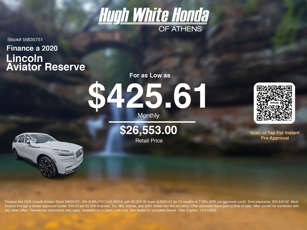 Our car loan payment calculator can help you calculate car payment options for this and other Honda finance offers that leverage the benefits of Honda Financial Services.@@ Call or drive in for Honda finance deals like this stunning 2020 Lincoln Aviator with finance options near Athens! Use our car monthly payment calculator to estimate your car payment, or try our car payment estimator to explore different loan terms. These Honda finance specials end 12/31/2025.