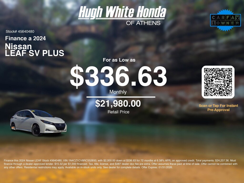 Discover Nissan LEAF SV PLUS Exceptional Savings at Hugh White Honda of Athens!