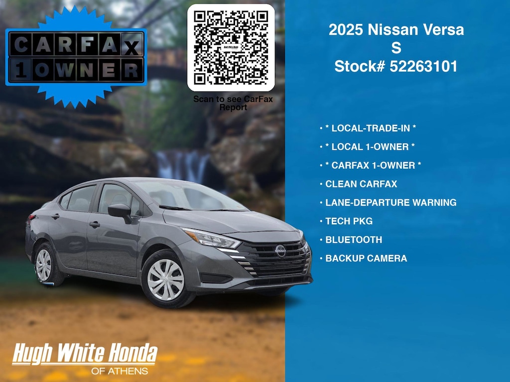 DESIRABLE FEATURES: * LOCAL-TRADE-IN *, * CARFAX 1-OWNER *, * LOCAL 1-OWNER *, CLEAN CARFAX, TECH PKG, LANE-DEPARTURE WARNING, BACKUP CAMERA, BLUETOOTH. Your 2025 Nissan Versa S is perfect for daily work or weekend road trips to our neighboring communities of Athens.