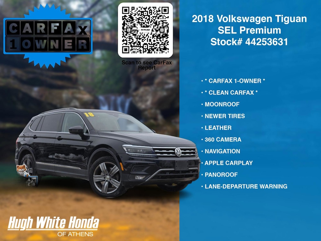 DESIRABLE FEATURES: * CARFAX 1-OWNER *, 360 CAMERA, APPLE CARPLAY, NEWER TIRES, CLEAN CARFAX, MOONROOF, PANOROOF, LEATHER, NAVIGATION, HEATED-SEATS, LANE-DEPARTURE WARNING, TECH PKG, ANDROID AUTO, REMOTE START, PREMIUM AUDIO, HEATED-STEERING WHEEL, KEYLESS-START, 3RD ROW SEAT, TURBO, POWER LIFT-GATE, BLUETOOTH, BLIND-SPOT MONITORING, HANDS-FREE LIFTGATE, BACKUP CAMERA, ALLOY-WHEELS, MULTI-ZONE AC, FOG LAMPS, SiriusXM, Remote entry. Your 2018 Volkswagen Tiguan SEL Premium is perfect for daily work or weekend road trips to our neighboring communities of Athens.