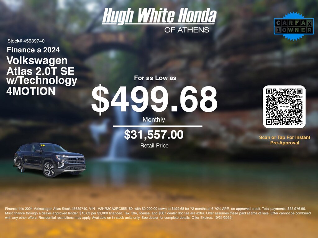 Our car loan payment calculator can help you calculate car payment options for this and other Honda finance offers that leverage the benefits of Honda Financial Services.@@ Call or drive in for Honda finance deals like this stunning 2024 Volkswagen Atlas with finance options near Athens!  Use our car monthly payment calculator to estimate your car payment, or try our car payment estimator to explore different loan terms. These Honda finance specials end 10/31/2025.